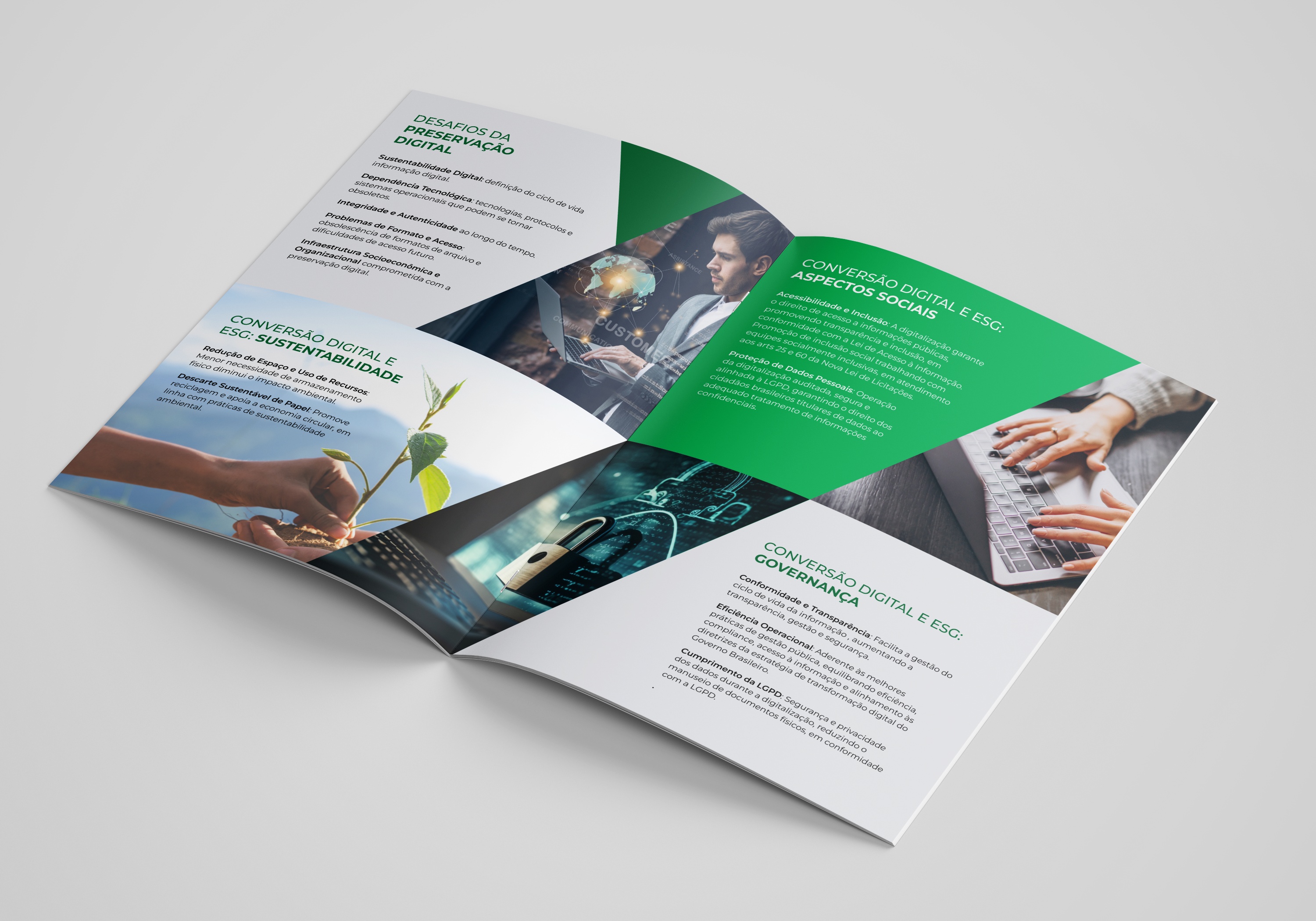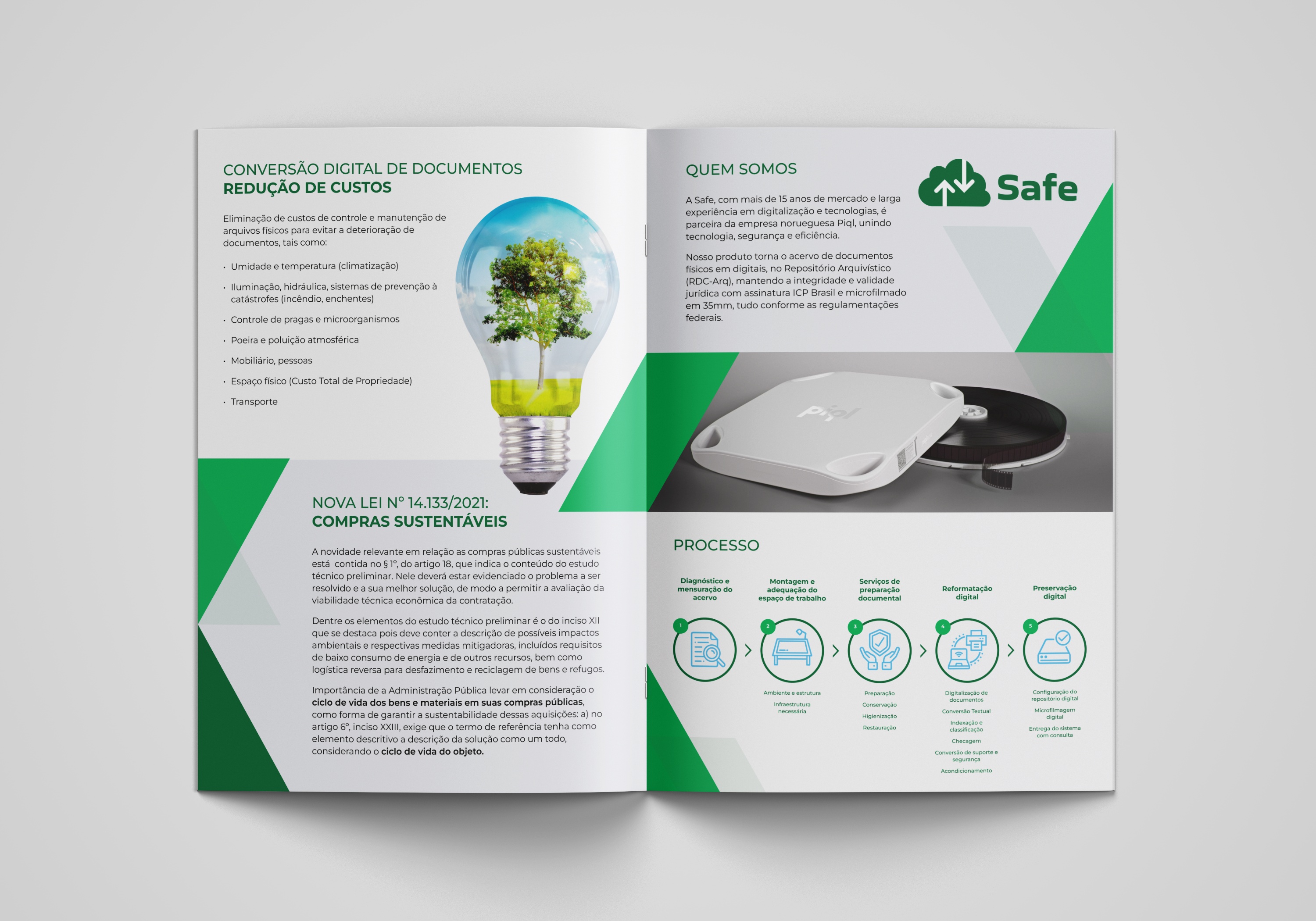 O resultado é um material institucional elegante e informativo, que reforça o posicionamento da Safe Digital como especialista em preservação digital e repositórios arquivísticos confiáveis (RDC-Arq) — transmitindo tecnologia, credibilidade e solidez em cada detalhe do design.
