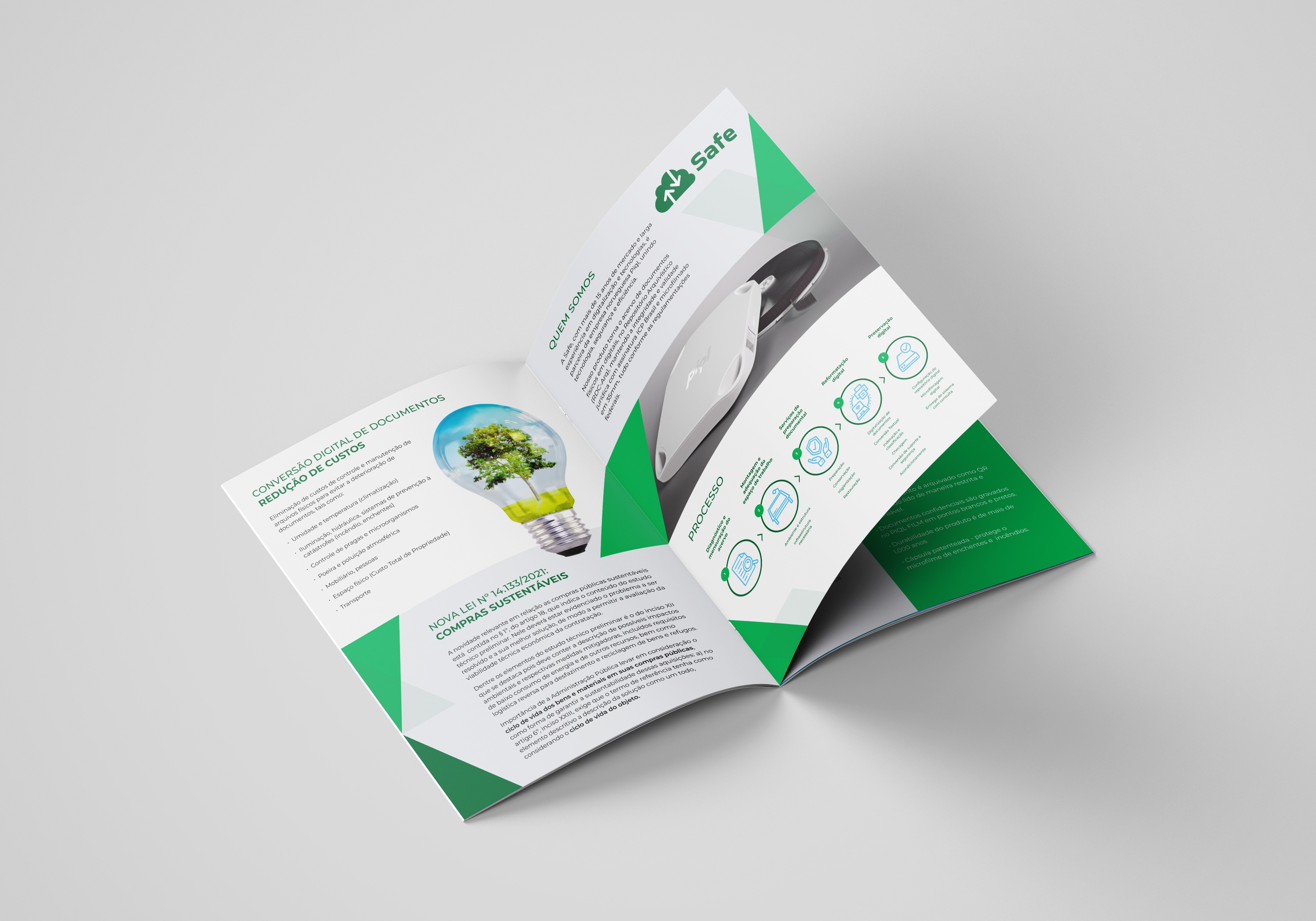 Cada página do folder foi planejada para valorizar os principais diferenciais da Safe Digital, como: